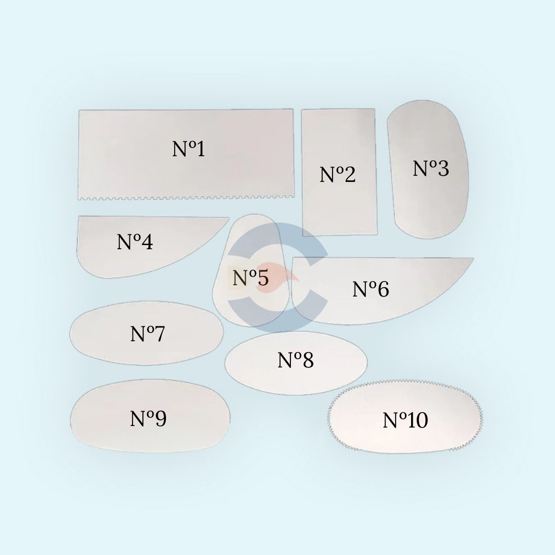 Lama metálica flexible con bordes texturados. Se utiliza para generar textura, patrones, relieves y efectos decorativos en piezas de arcilla.