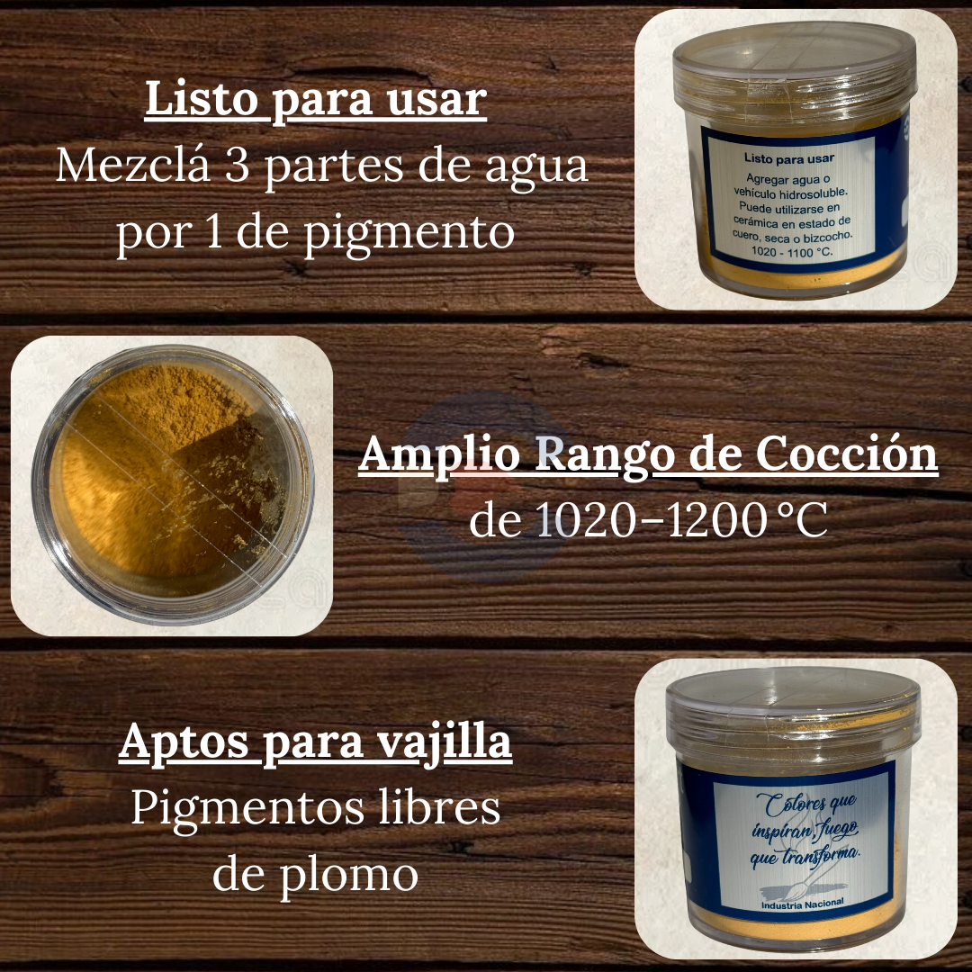 Este pigmento bajo cubierta viene listo para usar en práctico envase plástico de 25 gr, ideal para cerámica artística y utilitaria. Su fórmula es apta para vajilla y puede aplicarse sobre piezas en estado de cuero, seco o bizcocho, brindando gran versatilidad en el proceso creativo.