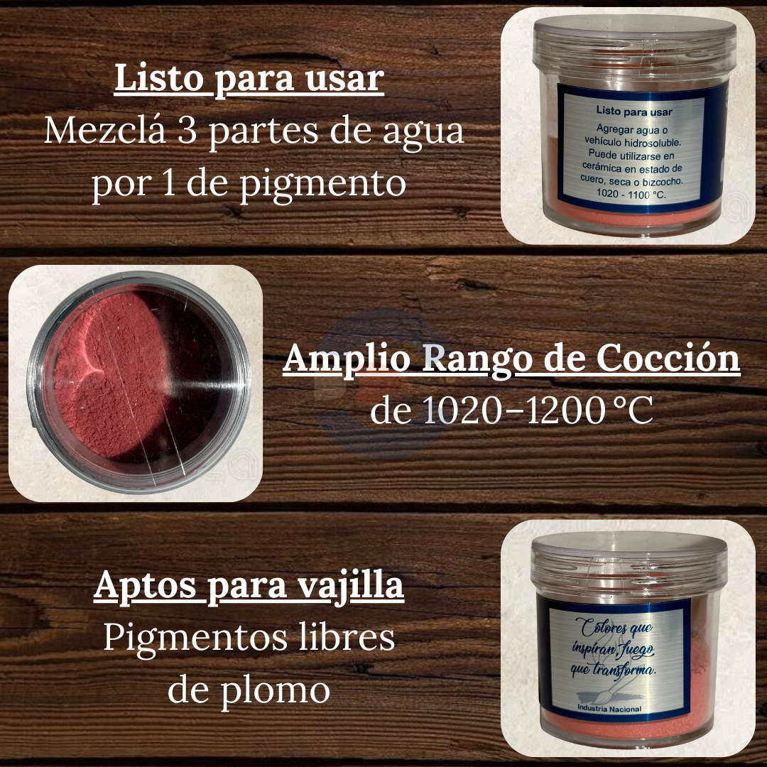Este pigmento bajo cubierta viene listo para usar en práctico envase plástico de 25 gr, ideal para cerámica artística y utilitaria. Su fórmula es apta para vajilla y puede aplicarse sobre piezas en estado de cuero, seco o bizcocho, brindando gran versatilidad en el proceso creativo.