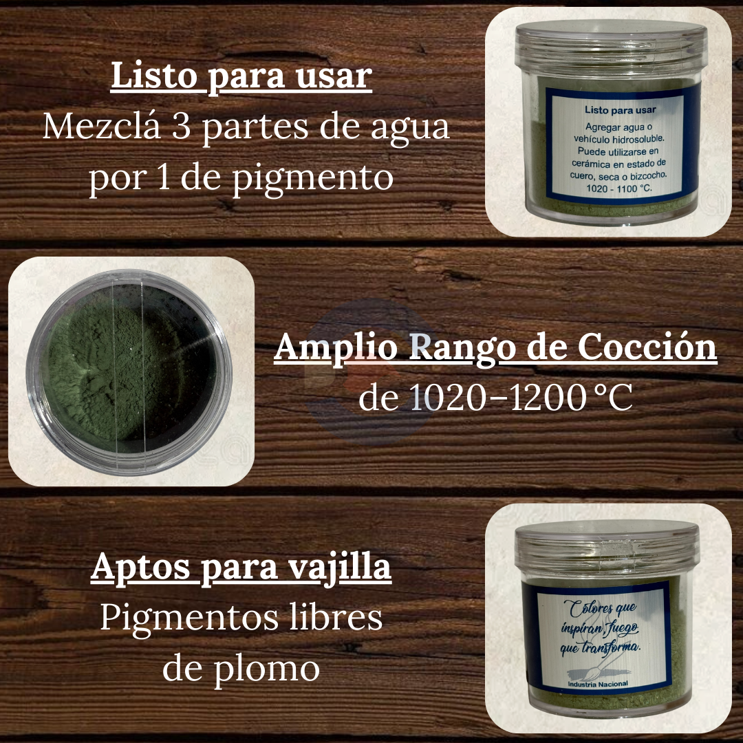 Este pigmento bajo cubierta viene listo para usar en práctico envase plástico de 25 gr, ideal para cerámica artística y utilitaria. Su fórmula es apta para vajilla y puede aplicarse sobre piezas en estado de cuero, seco o bizcocho, brindando gran versatilidad en el proceso creativo.