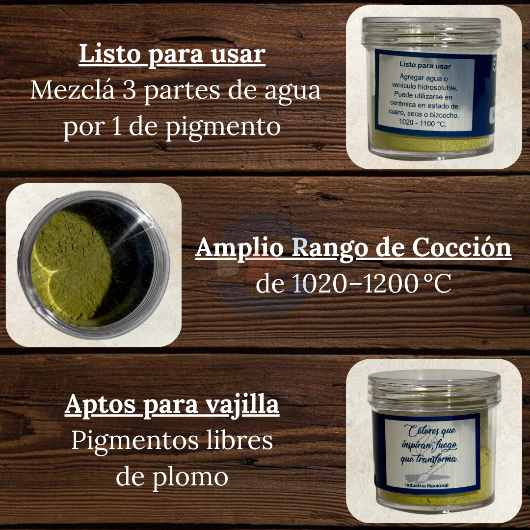Este pigmento bajo cubierta viene listo para usar en práctico envase plástico de 25 gr, ideal para cerámica artística y utilitaria. Su fórmula es apta para vajilla y puede aplicarse sobre piezas en estado de cuero, seco o bizcocho, brindando gran versatilidad en el proceso creativo.